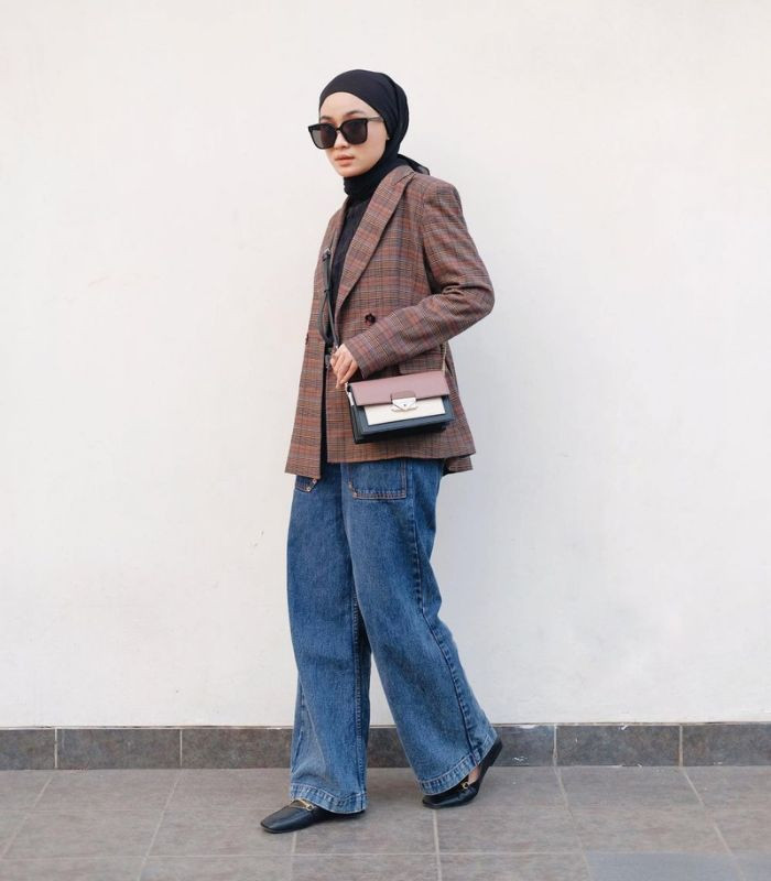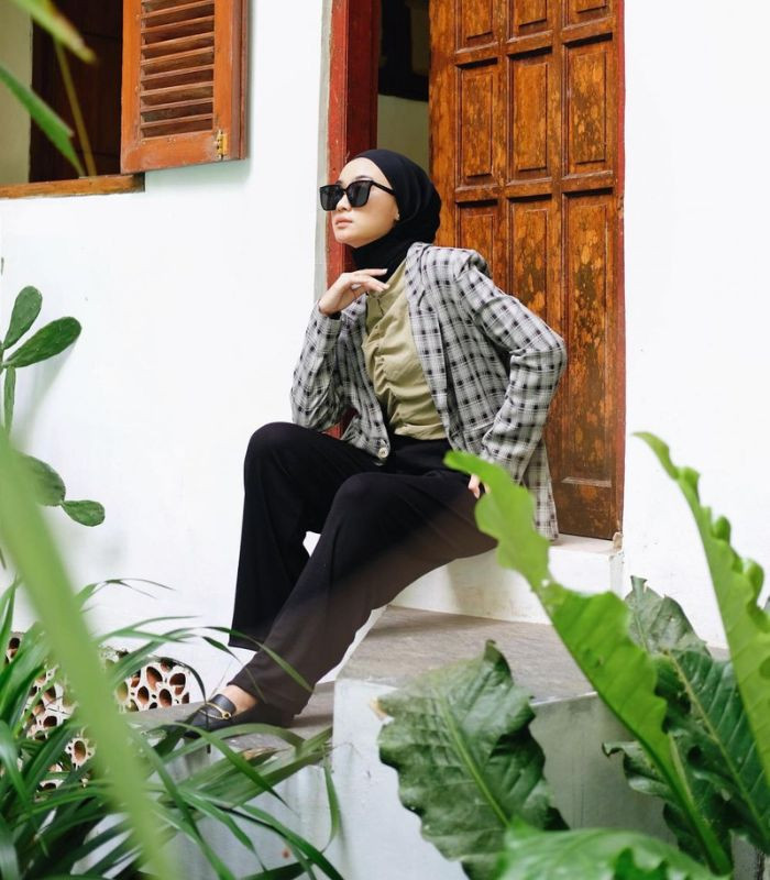 6. Penampilan untuk style yang eye catchy ini. Alifia memadukan kaus hitam yang senada dengan hijab pashmina dibalut dengan suit blazer warna hazelnut motif plaid dipadankan dengan baggy jeans serta mule shoes, sunglasses, dan sling bag berwarna hitam yang tampak serasi.