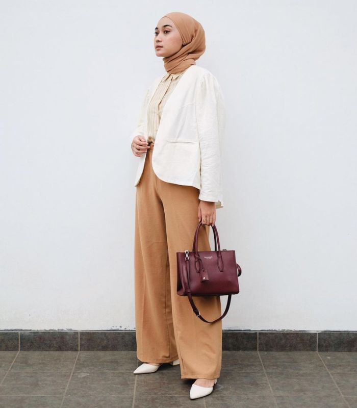 10. Tampil stunning bernuansa nude kalem yang terkesan manis. Perpaduan kemeja warna cream dibalut suit blazer putih dengan wide leg pants berwarna caramel yang senada dengan hijab pashmina, tak lupa kenakan mule shoes dan hand bag andalan, agar makin stand out gayamu!