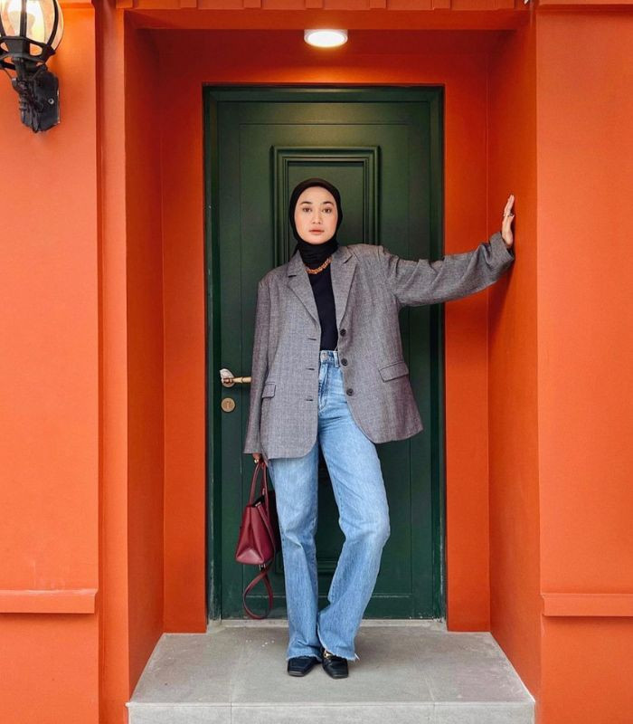 11. Terakhir, Alifia menggabungkan kaus hitam yang senada dengan hijab pashmina dibalut suit blazer warna abu-abu serta baggy jeans dan loafer shoes hitam, berikan statement point pada outfit dengan kenakan aksesori kalung, terlihat casual dan catchy abis!