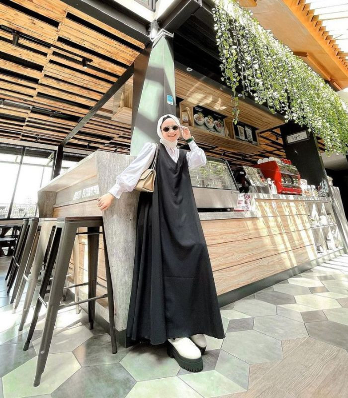 6. Padukan blouse warna putih yang senada dengan hijab pashmina dibalut basic jumper dress hitam, kenakan platform shoes putih, shoulder bag dan sunglasses, bikin penampilanmu makin stunning!