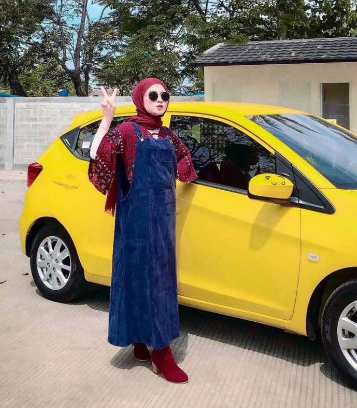 7. Kombinasikan blouse berwarna merah maroon yang senada dengan hijab pashmina dan lace up boots kemudian dibalut jumper dress denim yang bikin look-mu makin terlihat kece abis!