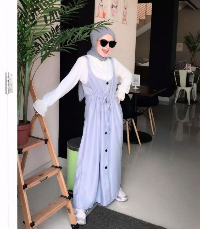 8. Gunakan kemeja lengan panjang putih dibalut jumper button dress berwarna silver yang senada dengan hijab pashmina, lengkapi outfit dengan sneakers putih, bikin penampilamu makin terkesan simple namun tetap terlihat casual look yang nyaman.
