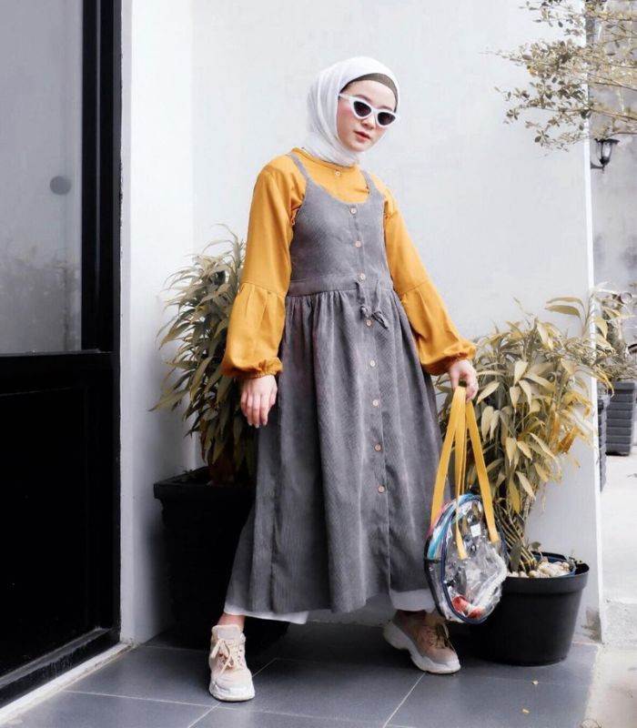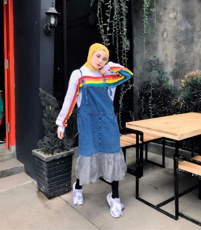 11. Tampil playful yang terkesan ceria dengan memadukan sweatshirt motif stripe berwarna-warni dibalut dengan jumper dress denim dipadankan dengan hijab pashmina warna kuning mustard serta gunakan sneakers andalanmu!