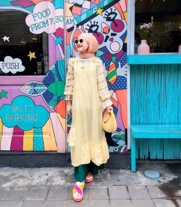 10. Penampilan dengan nuansa warna cerah yang tampak cheerful ini! Padukan blouse motif striped dibalut dengan jumper midi dress nuansa warna kuning yang senada, dipadankan dengan hijab pashmina warna peach serta pleated skirt warna green bottle dan ditambah kenakan wedges sandals.