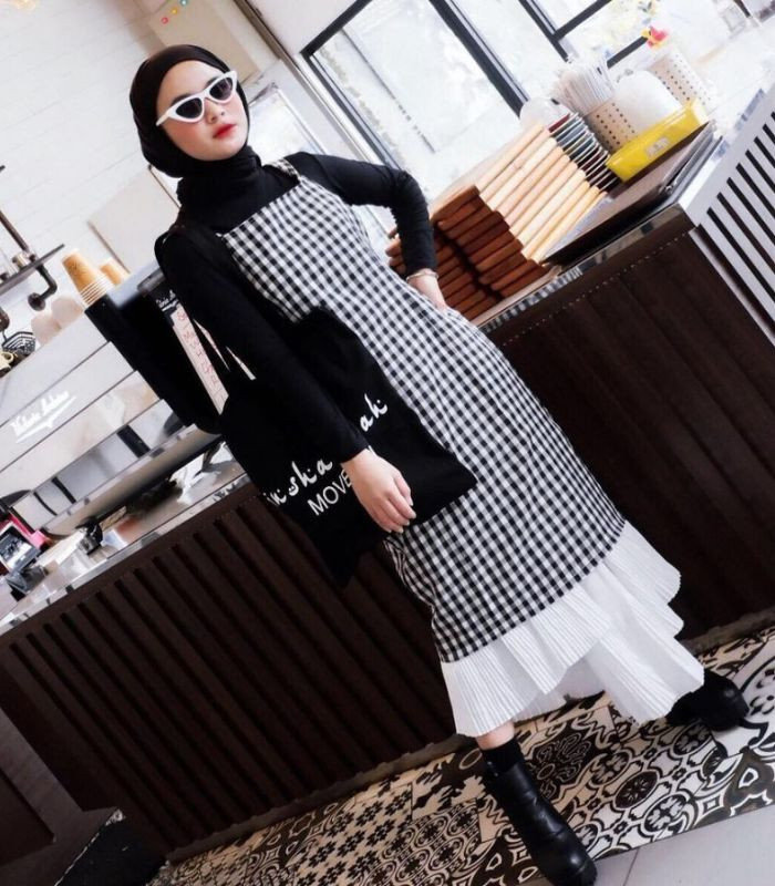 12. Terakhir, Miara menggabungkan long sleeve t-shirt hitam yang senada dengan hijab pashmina dibalut jumper dress bermotif plaid nuansa monokrom dengan aksen pleated skirt pada bagian bawah, tambahkan boots hitam bikin penampilanmu makin terkesan chic abis!