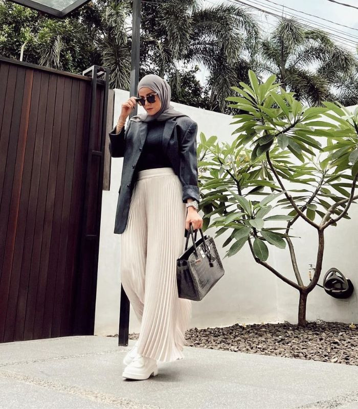 Perpaduan manset dibalut oversized blazer berwarna hitam senada dengan pleated cullote pants berwarna broken white serta hijab pashmina dark grey, ditambah sneakers putih dan hand bag hitam, bikin penampilan makin stylish yang elegan.