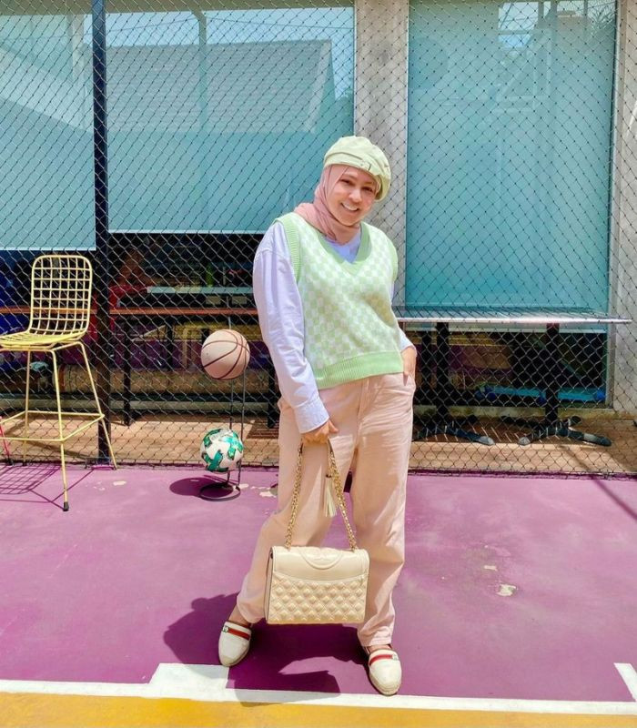 Mengusung konsep outfit serba pastel, perpaduan kemeja putih dibalut gingham knit vest sage green dengan celana jeans warna pink pastel dipadakan dengan hijab pashmina berwarna coksu, ditambah baret hat sage green dijadikan sebagai statement point pada outfit. Jadi bikin penampilan makin terlihat kece abis!