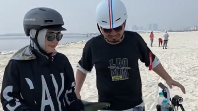 April Jasmine dan Ustad Solmed baru menyelesaikan gowes sejauh 14 kilometer di tepi satu pantai dalam cuaca yang cukup cerah.