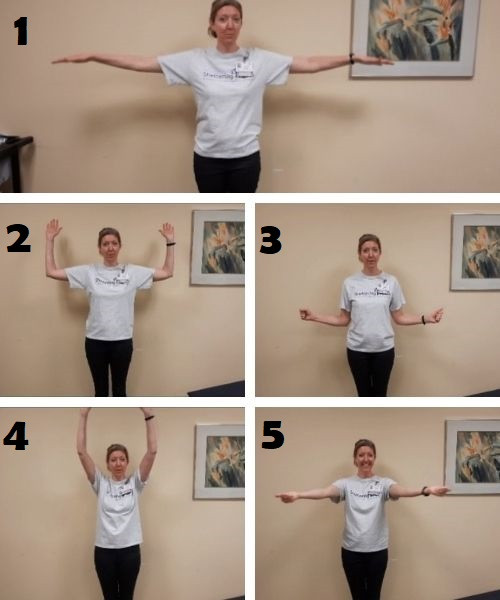 Pegang lengan Anda setinggi bahu dengan ibu jari mengarah ke luar (telapak tangan ke atas) dan rentangkan tangan Anda di samping tubuh Anda lalu kembali ke tengah.